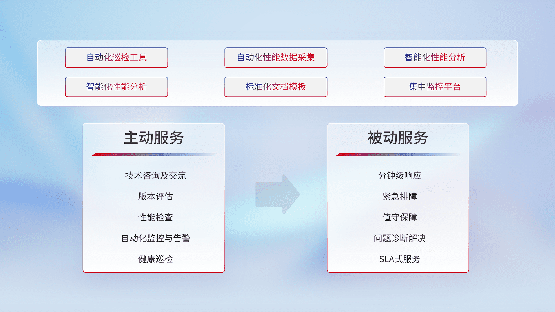 智能化工具和标准化文档,,,,保障服务质量,,,,提供主动服务(包含技术咨询、、、版本评估、、、、性能检查、、、、自动化监控与告警、、、、健康巡检)和被动服务包含(分钟级响应、、、、紧急排障、、值守保障、、问题诊断解决、、、SLA服务)。。