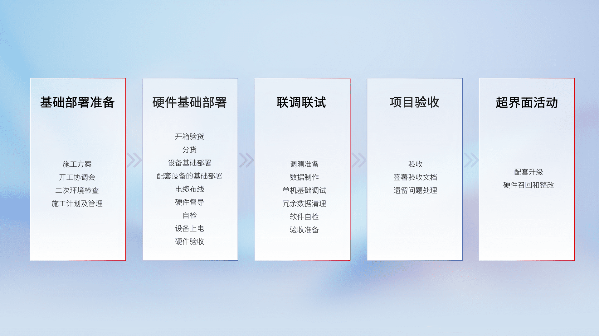 从基础部署准备、、、硬件基础部署、、、、联调联试、、、项目验收、、、越界面活动的全过程可追溯,,,,保证施工质量和进度。。。。
